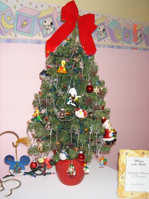 I finished Elizabeth's bedroom Christmas tree, it looks so pretty. I have attached two pictures of it plus pictures of her with her band-aids from her shots today. She slept in my arms for about two hours late this afternoon, she was wiped out from her morning. I just put her down for the night and she is out cold! Tired baby. I can't wait for tomorrow to take her to see Santa Claus, she is going to be so cute. We are bringing our camera so I will be able to post some pictures. We are putting up our Christmas tree on Saturday, can't wait for that. By the way Cassie as I type this I'm sure you are decorating your tree, I know it will be beautiful :)